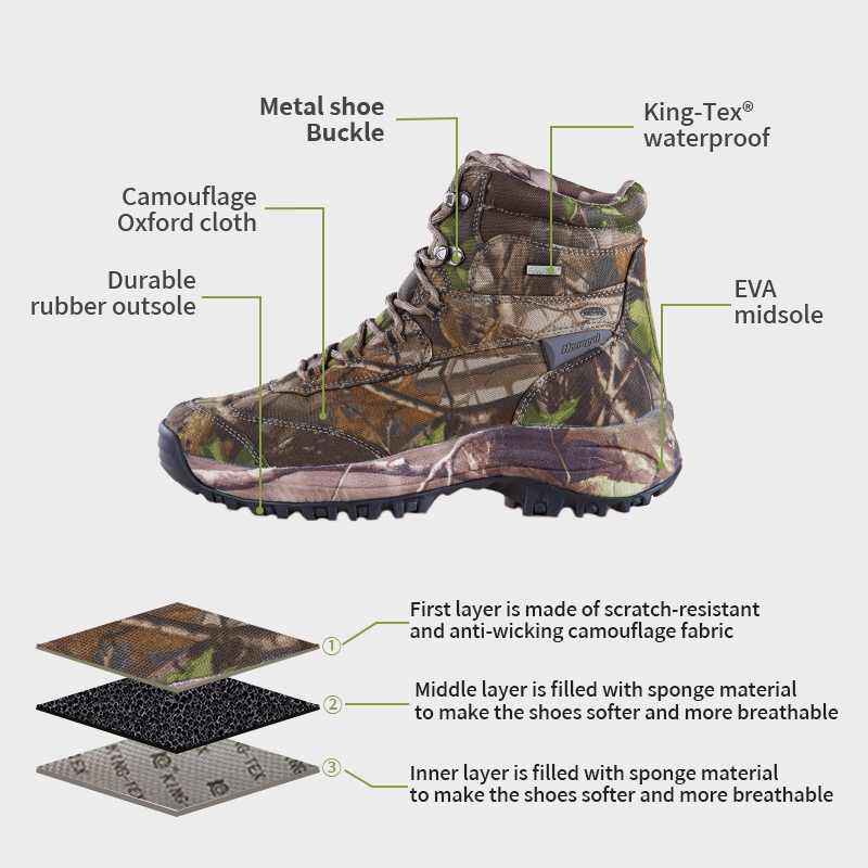 ①Перший шар виготовлений із стійкої до подряпин і вологи камуфляжної тканини. ②Середній шар наповнений губчастим матеріалом, щоб зробити взуття м’якшим і більш дихаючим. ③Внутрішній шар наповнений губчастим матеріалом, щоб зробити взуття м'якшим і більш дихаючим.