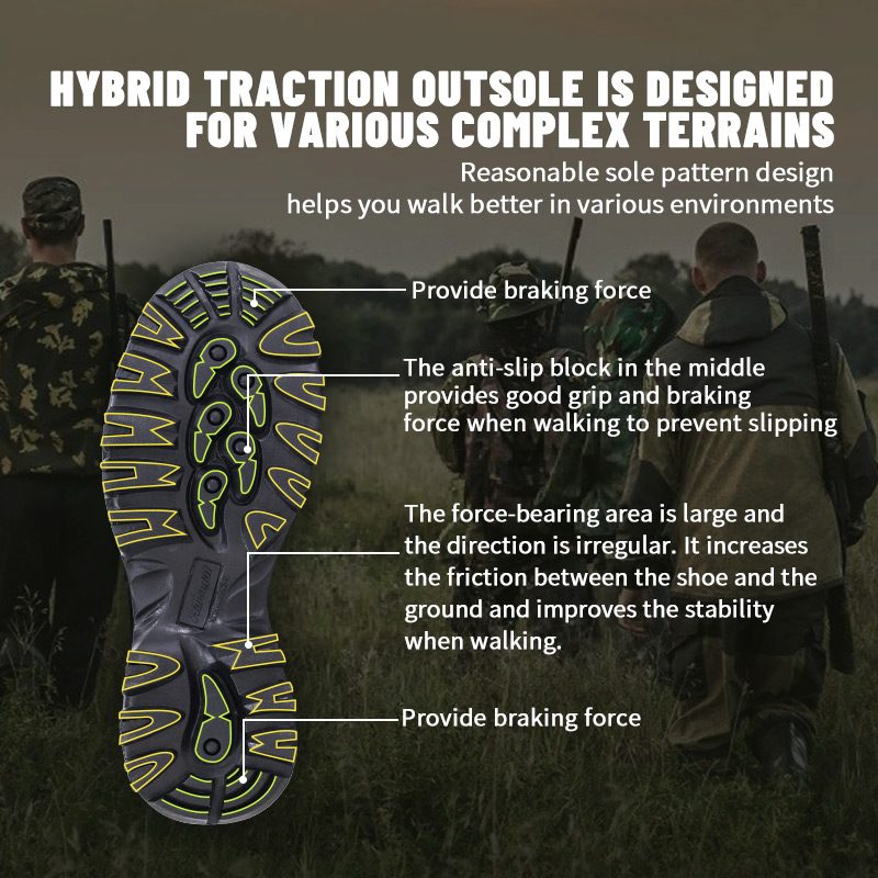 ①Еластична вологопоглинаюча устілка Poliyou зберігає внутрішню поверхню сухою. ②Проміжна підошва EVA, обгорнута камуфляжною тканиною, амортизація та амортизація. ③Міцна гумова підошва, нековзка та зносостійка.