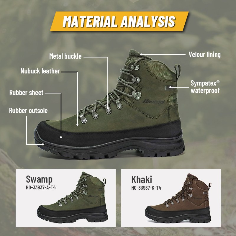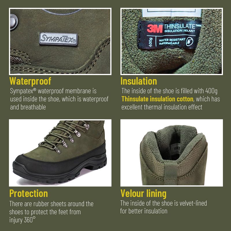 Ці мисливські черевики Sympatex із водонепроникною ізоляцією Thinsulate доступні для індивідуального налаштування кольорів, матеріалів і деталей з мінімальною ціною 800 пар, що ідеально підходить для співпраці з брендами та групових закупівель. І ці мисливські черевики мають наступні переваги: