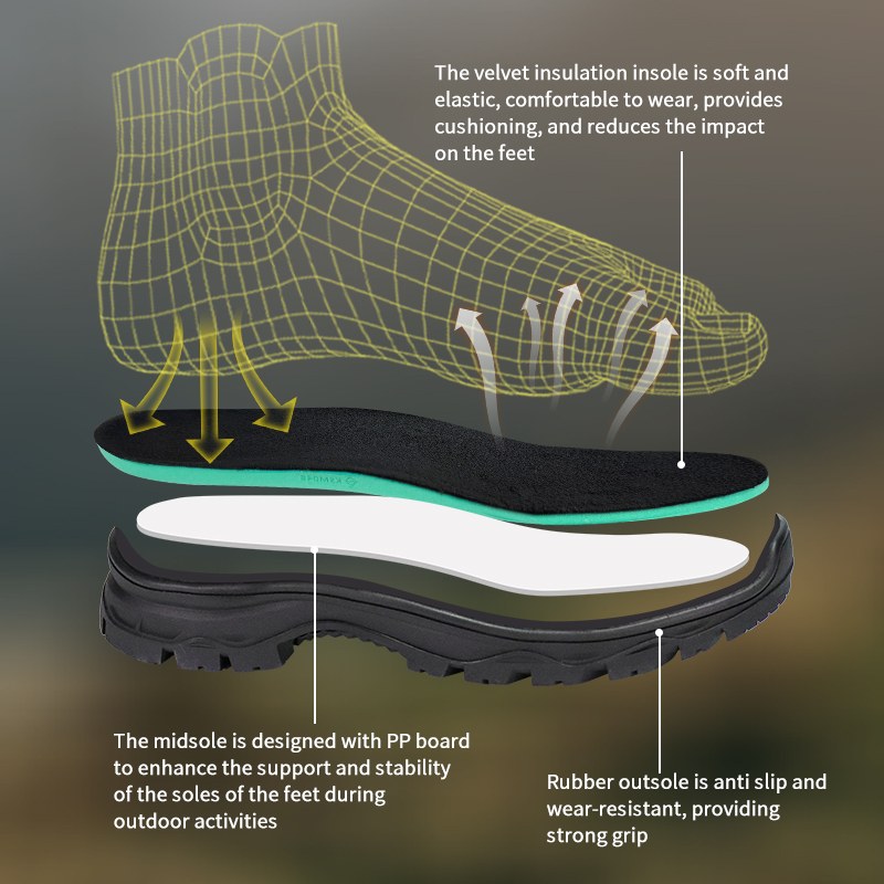 ①Оксамитова підкладка. М'яка під ногами. Поглинає вплив. Проміжна підошва ②PP для стабільної підтримки. ③Гумова підошва, яка не відпускає. Захоплюється, довговічна, залишається надійною.